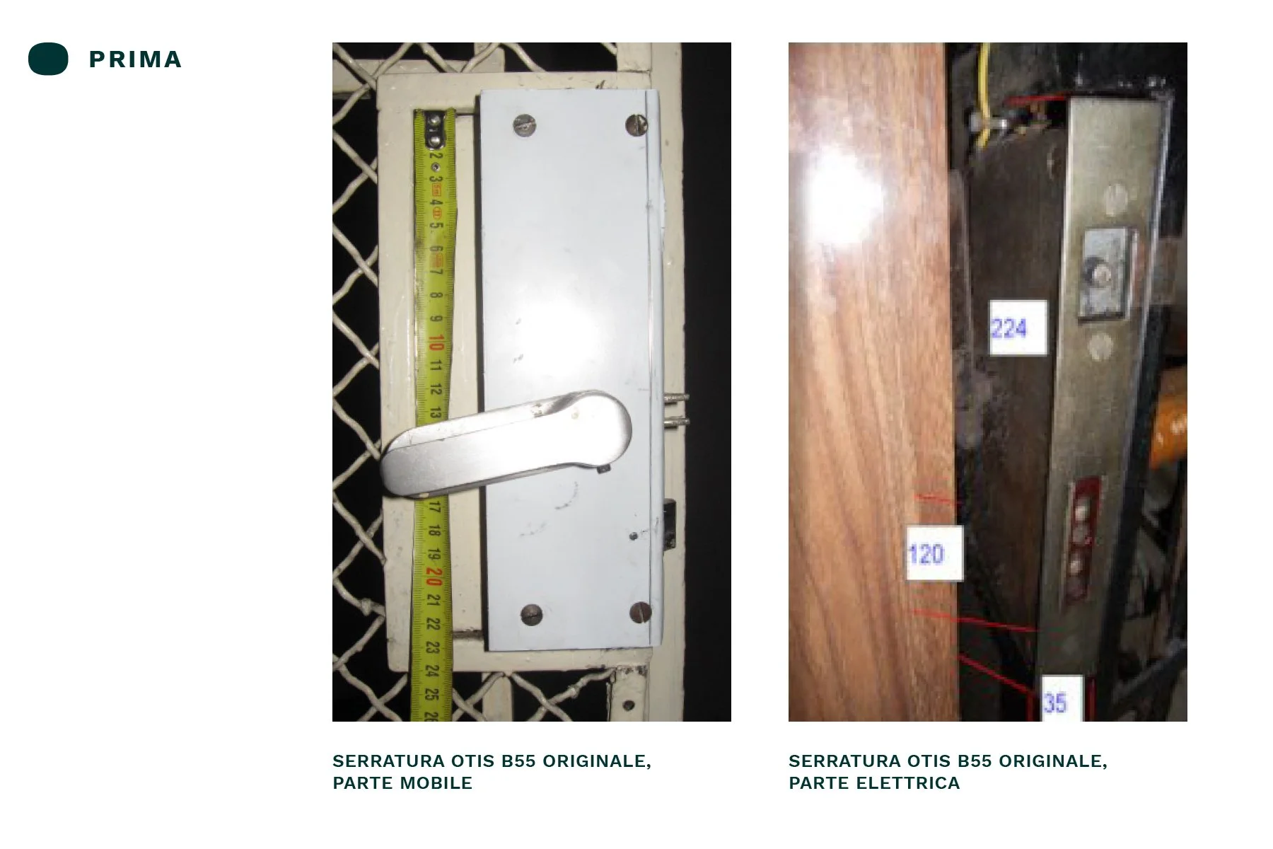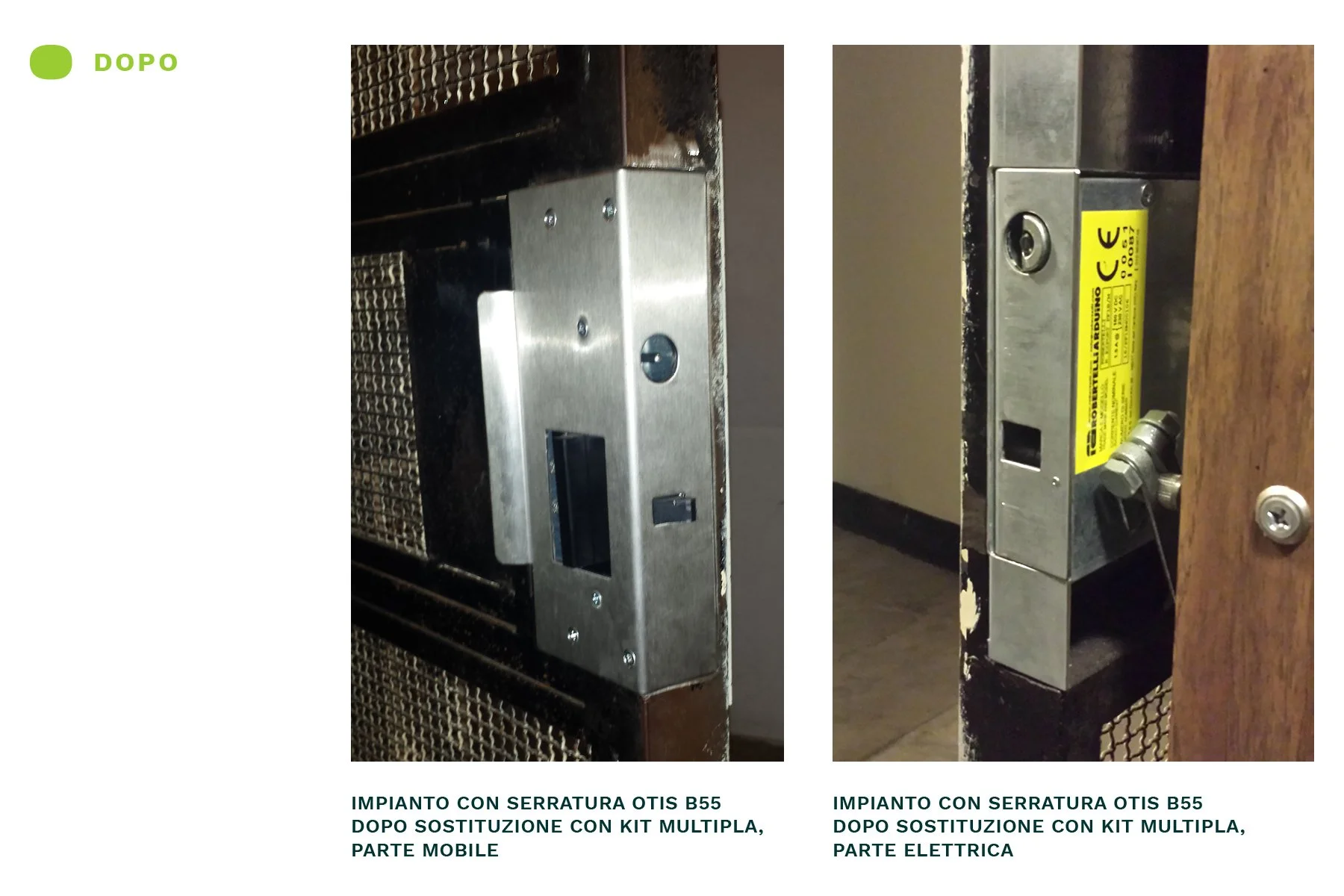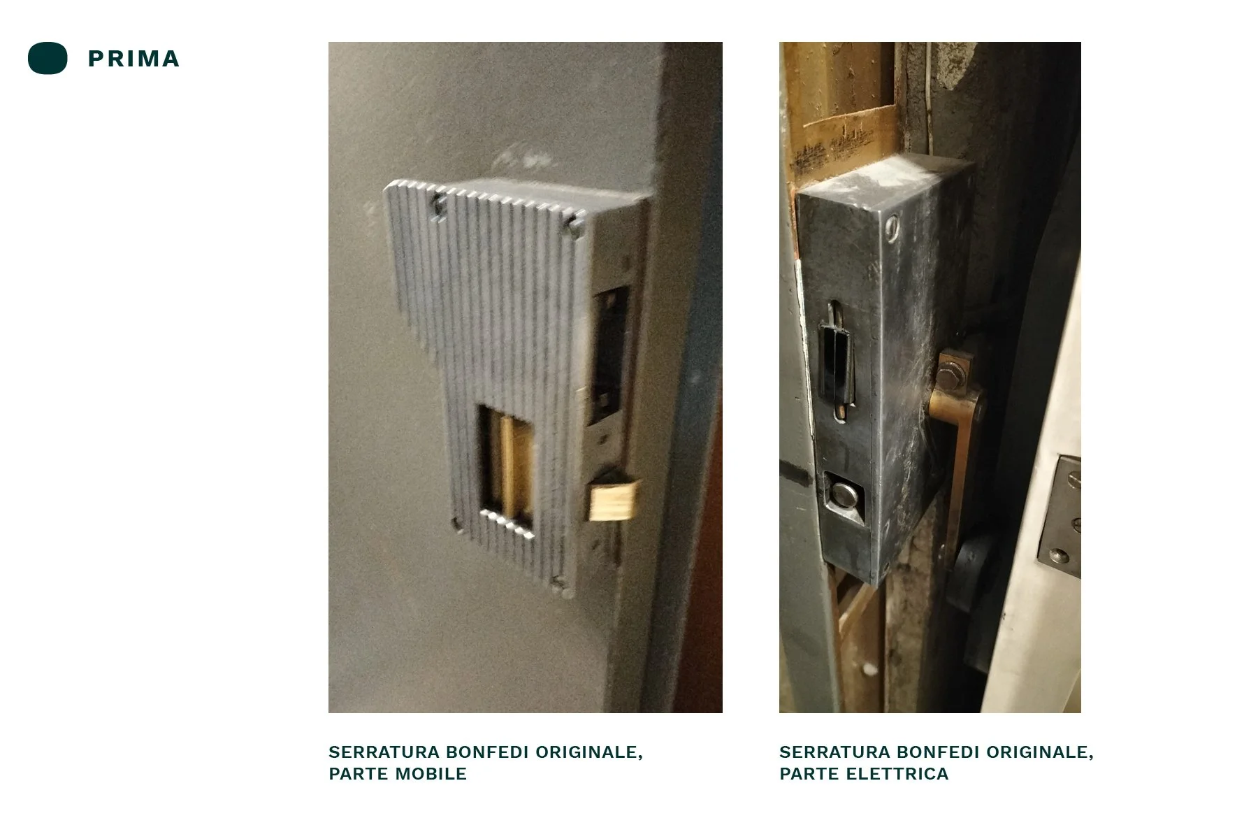 Bonfedi Otis B55 Serratura SAFOV primi anni '50, impianto con porte in legno Serratura ROBERTELLI anni '50, cancello e vano in rete, manuale/pomo Serratura ROBERTELLI metà-fine anni '60, porta a spinta Serratura ROBERTELLI metà-fine anni '60, porta manuale/pomo Parte mobile serratura CIOCCA, Torino